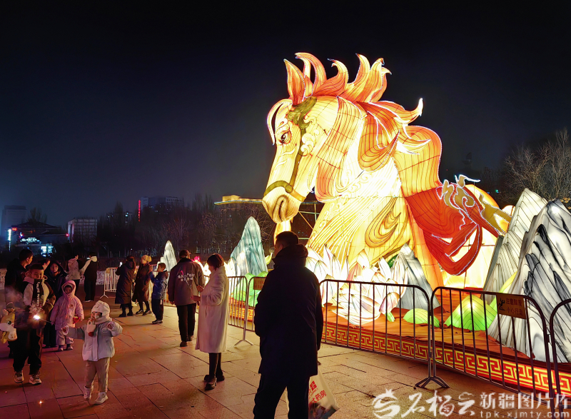 1月1日晚,游客在乌鲁木齐市南湖市民广场游玩。 南湖市民广场展区堪称本次花灯展的“人气担当”,灯组设计将新疆地域风情与创意巧思完美融合。在广场西门空地的核心灯组“一马当先”格外夺目,这座高7米、长20米的巨型灯组,以灵动的生肖马形象为核心,巧妙融入天山、雪莲、山川湖泊等新疆标志性元素。灯组还暗藏科技巧思,马眼处搭载动态特效,每隔1至15秒便会自动眨动,灵动传神的模样引得游人纷纷驻足,用镜头定格下这独具特色的光影瞬间。