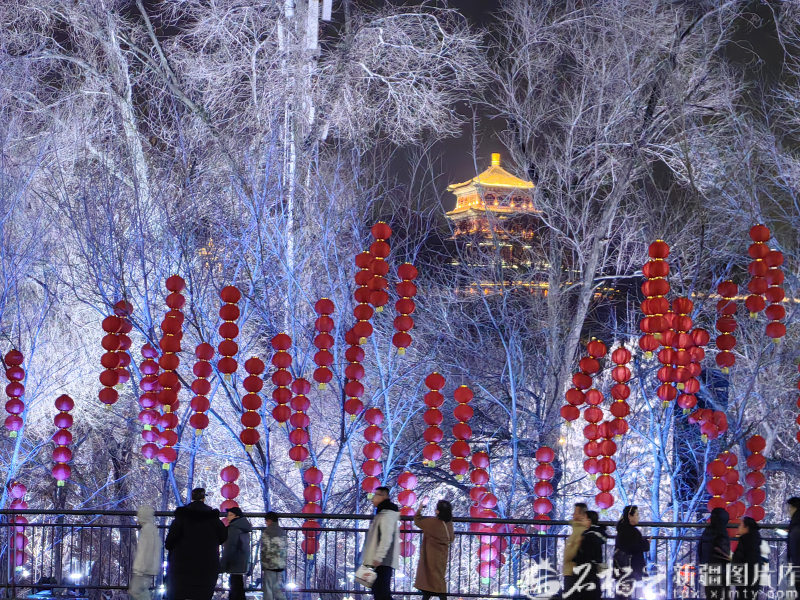 1月1日晚,游客在乌鲁木齐市西大桥上拍照“打卡”。 西大桥展区紧扣“冬季光影”主题,依托周边自然景致错落布设特色灯组。皑皑白雪与璀璨灯光相映成趣,游客漫步其间,既能感受城市夜色的静谧雅致,又能沉浸式体验光影艺术的绚丽多姿,收获别具一格的冬日游玩体验。