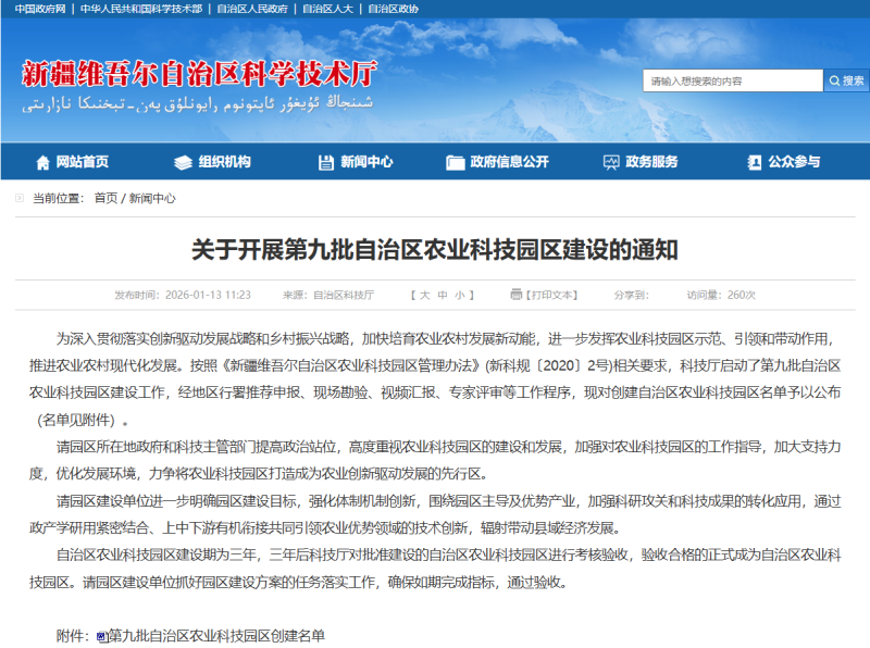 第九批自治区农业科技园区创建名单公布