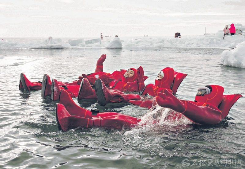 1月11日,在新疆生产建设兵团第十师188团布伦托海景区,游客身着红色特制防寒服体验冰浮项目。李正虎摄