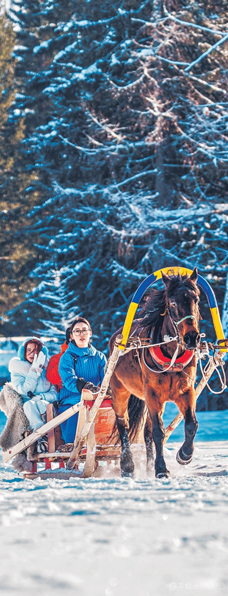 1月3日,喀纳斯景区银装素裹,游客乘坐马拉爬犁在雪林中穿梭,感受独特的冰雪魅力。赵桂锐摄