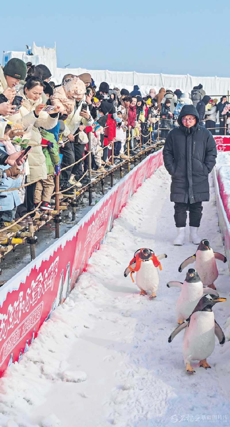 1月11日,昌吉市庭州生态绿谷“丝路冰城”冰雪大世界,游客在观赏企鹅表演。陶维明摄