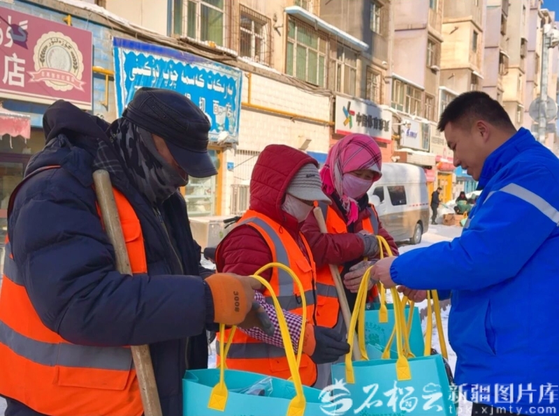 在乌鲁木齐市,中通快递“有你的冬天不太冷”活动“送温暖”现场,除给快递小哥外还给环卫工人送了御寒物资。张鹍摄