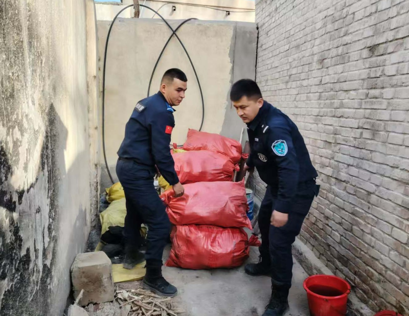 1月14日,民丰县公安局城镇派出所民辅警为七旬老人搬运过冬燃煤。通讯员 陈子朝摄 短短1小时,一吨燃煤全部送至老人家中,并整齐堆放在指定位置。燃煤搬运完毕,玉散江并未急着离开,而是关心起老人的生活近况与身体状况。得知她女儿常年在外地打工,儿子身体不好等困难时,玉散江当即要过老人的手机,将自己的电话号码存入,并设置快捷拨号,叮嘱道:“阿恰,以后不管遇到啥困难,都能打这个电话,我们随叫随到!”