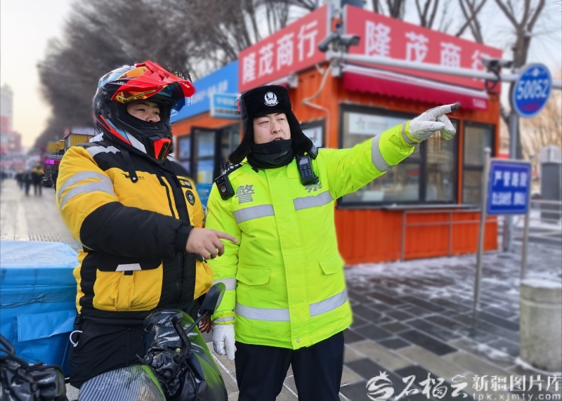 1月20日,民警在街头执勤。 为保障户外工作者御寒需求,不少社区和商家设立了暖心服务点,免费提供姜茶和临时休憩的场所。一位正在暖心服务点取暖的快递员捧着热姜茶说:“天虽冷,但心里是暖的,这些关怀让我们干活更有劲儿了。”