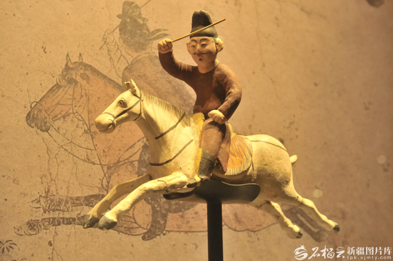 彩绘泥塑打马球俑是唐代彩绘泥俑,出土于吐鲁番市阿斯塔那墓葬,现收藏于新疆博物馆。 打马球者头戴惯头,蓄八字短须,身穿圆领紧身绛色窄袖长袍,骑于白马飞奔;脚穿黑色皮靴,足踩马蹬,两目注视地面,右臂扬起,高举鞠杖,呈击球状。马躯体浑圆,前胸宽阔,四肢强健。打马球佣整体造型比例匀称,造型精巧,形象逼真,极富动感,不仅展观了驰马挥杖强体魄的大唐雄风,也是多元文化交流的见证。