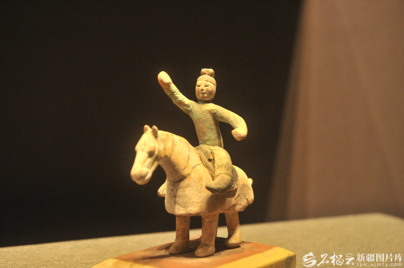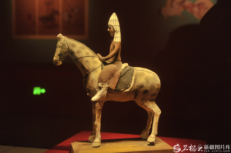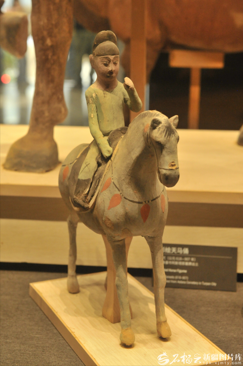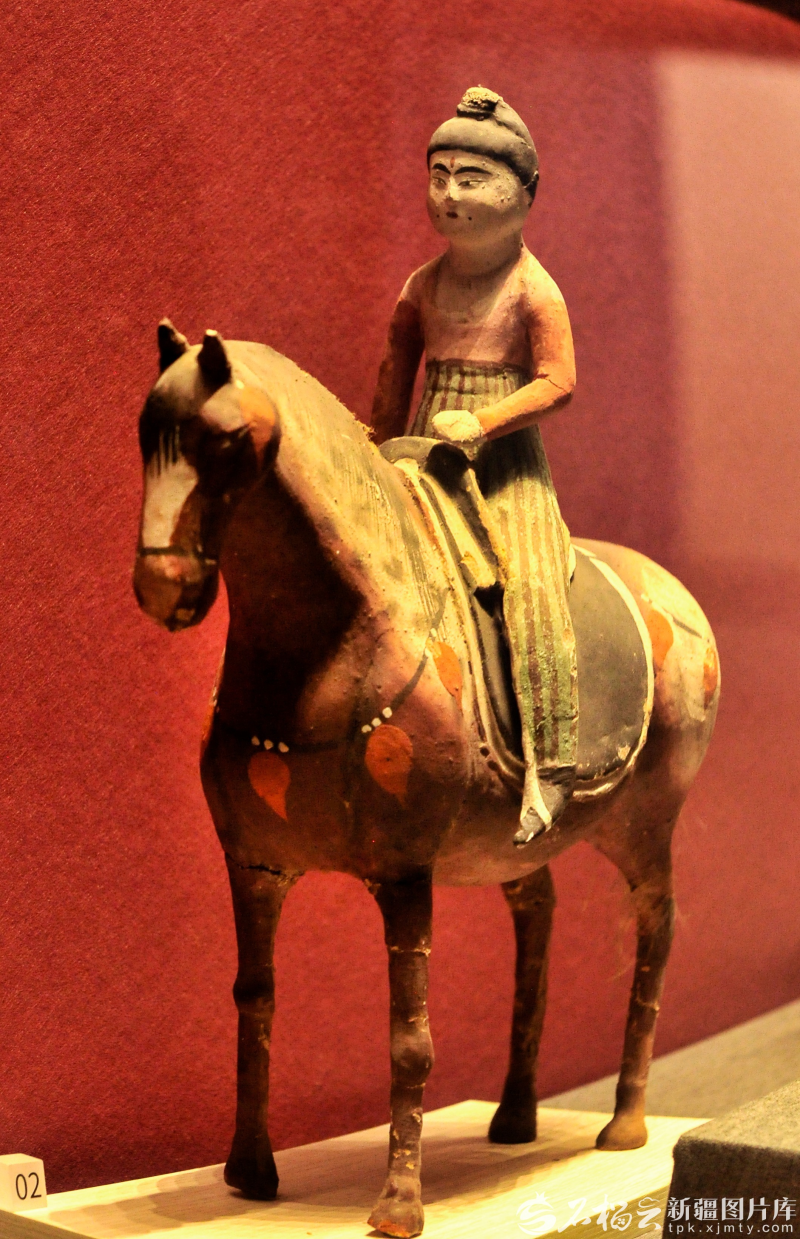 唐代彩绘泥塑马舞俑(又称彩绘泥塑骑马舞俑),出土于吐鲁番市阿斯塔那墓葬,现藏于新疆博物馆。 舞俑头戴小冠,身着窄袖短衣,骑于昂首的马背上,一手高举、一手弯曲,仿佛正在马背上表演舞蹈,姿态生动活泼,充满动感。它是唐代西域乐舞文化的生动见证,既反映了丝绸之路带来的文化交融,也体现了当时西域地区丰富多彩的娱乐生活。