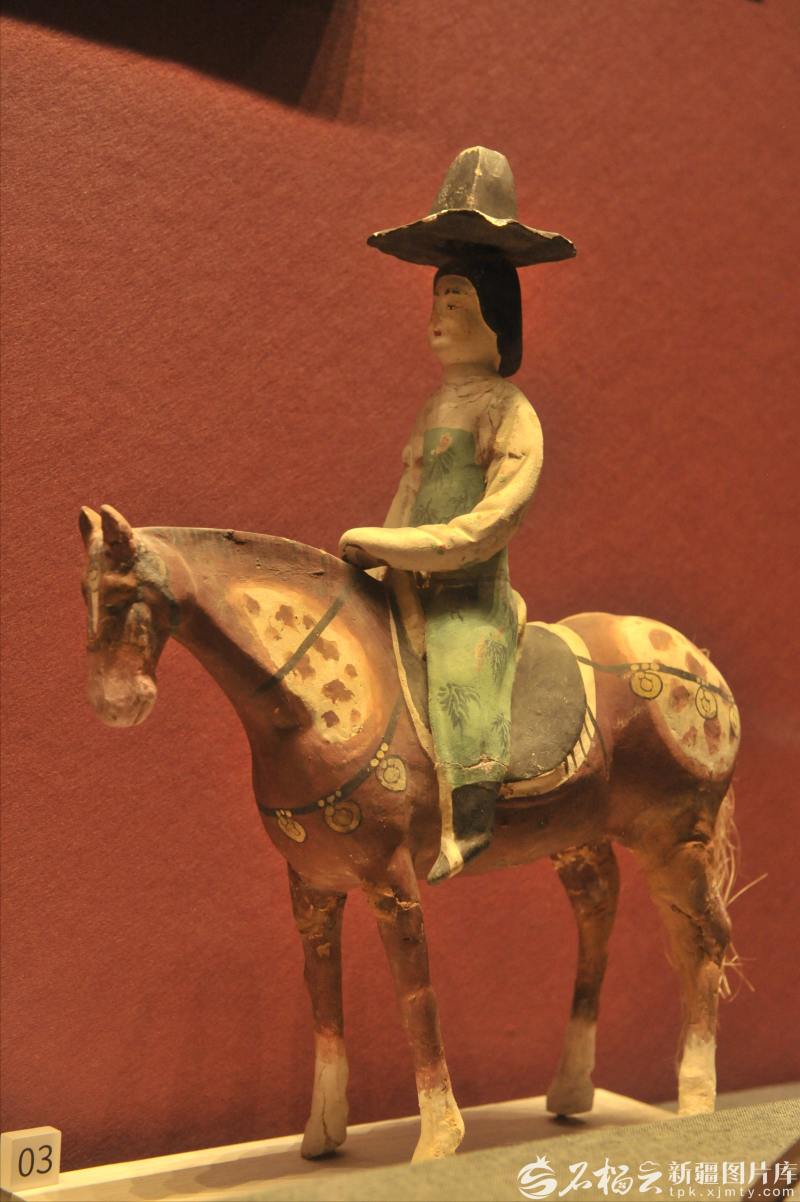唐代彩绘骑马仕女俑,出土于吐鲁番阿斯塔那墓葬,现藏于新疆博物馆。 仕女面容丰腴,头戴由西域传入的尖顶胡帽,端坐马背,姿态优雅,既展现了唐代女性骑马出行的飒爽风貌,也体现了当时女性较高的社会地位。作为胡汉文化交融的产物,它是丝绸之路服饰文化交流的生动见证,更反映了唐代西域与中原的紧密联系,是中央政府治理西域的实物佐证。