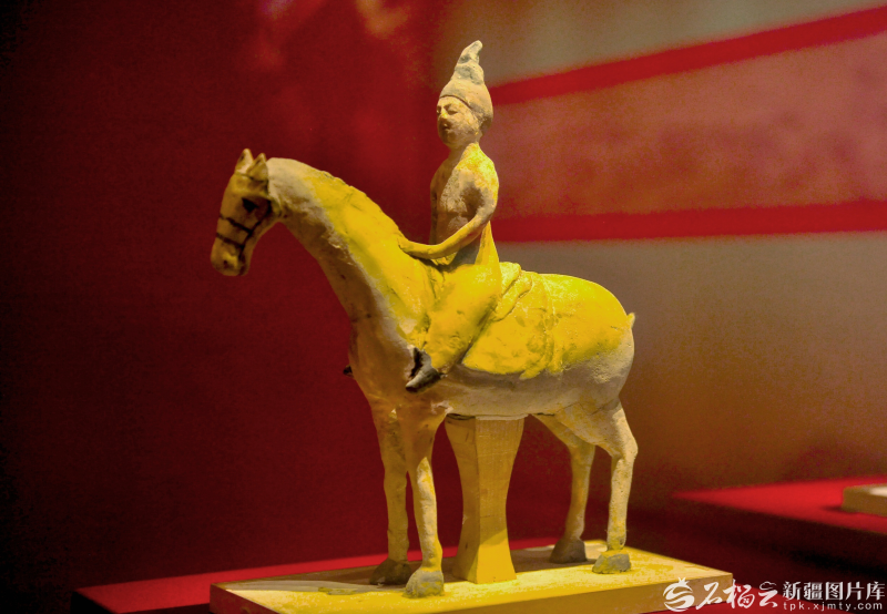 唐代彩绘泥塑骑马武士俑,出土于吐鲁番市阿斯塔那墓葬。它以当地黏土塑造,再施以彩绘,是阿斯塔那墓葬中极具代表性的泥塑俑之一。现收藏于新疆博物馆。 武士头戴白底黑线格纹头盔式风帽,身穿黄色长袍,足蹬长靴,面容端庄、神情威严,端坐于一匹高大矫健的白马上,马身还绘有棕色圆点,马背铺有鞍鞯,尽显唐代戍边将士的英武之气。武士的服饰与装备融合了中原与西域的特点,是丝绸之路文化交流的生动见证。彩绘骑马武士泥俑是唐代戍边军队的真实写照,反映了中央政府对西域的有效管辖与军事布防。