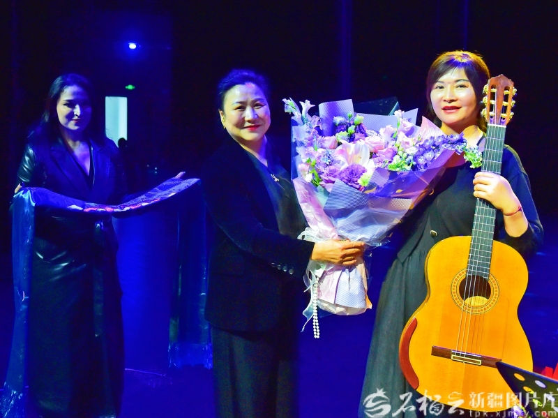 2月23日,观众给吉他演奏者献花。 2月23日,吉他专场奏响动人旋律。吉他博物馆创办人王海波带领团队,将新疆地域特色与世界名曲巧妙融合,倾情演绎《送我一枝玫瑰花》《帕米尔的冬天》等14首经典作品。悠扬旋律、深远意境,让现场观众沉醉不已。
