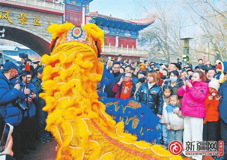 2月21日,在水磨沟公园,社火队员舞狮助兴,与游客互动。(记者陈岩摄)
