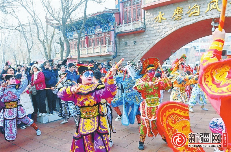 2月24日,在水磨沟区天山明月城·丝路有戏景区,来自广东潮汕的英歌舞队带来了舞狮、英歌舞以及粤剧、咸水歌等非遗社火演出,让市民游客沉浸式感受来自岭南的歌舞魅力。