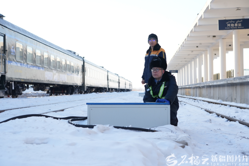 石榴云/新疆日报记者 李行 2月25日,阿勒泰火车站。K9766次列车停靠在站台上,往来的旅客络绎不绝,奎屯车务段阿勒泰站客运上水员王大震和防护员一起,走在站场的雪地上,脚下传来一阵阵“咯吱”声,他们即将开始上水作业。 “K9766次列车,冲管作业。” 在上水井旁,按下注水开关,管口处的水淅淅沥沥。一条上水管长15米左右,天气寒冷的时候,管里如果结冰就要一段一段地排查。 “水流小,应该是管口冻住了。”王大震拿出随身带的起子,清除管口积冰后,这次冲管作业成功了。 “K9766次列车,11号车厢上水作业。”拖着上水管来到客车旁,输出口令后,王大震熟练将上水管插入注水口,返回上水井旁,启动注水开关。