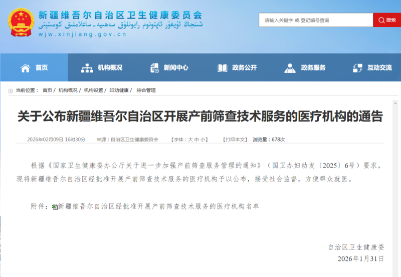 近日,自治区卫生健康委发布通告称,为进一步加强产前诊断中的产前筛查服务依法执业依法管理,切实维护群众健康权益,公布了全疆可开展产前筛查技术服务的127家医疗机构,为各族孕产妇提供便捷、优质的出生缺陷防控服务,切实守护母婴健康福祉。