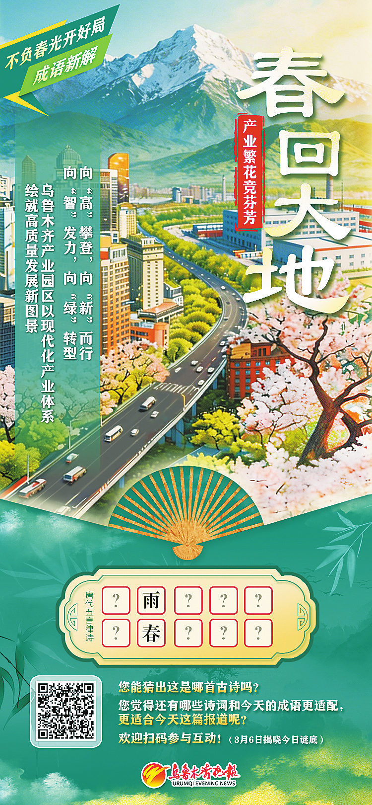 互动活动 春回大地,万象更新。乌鲁木齐晚报推出“飞花迎春·奋进新程”诗词成语互动活动,每日一“春”、每日一主题,以诗词寄情,以笔墨抒怀,邀您共赏春光、共话发展、共赴新程。 扫描二维码下载眼界新闻客户端,在“不负春光开好局”栏目稿件下参与跟帖互动,让我们共同带着诗情画意向着春天出发。