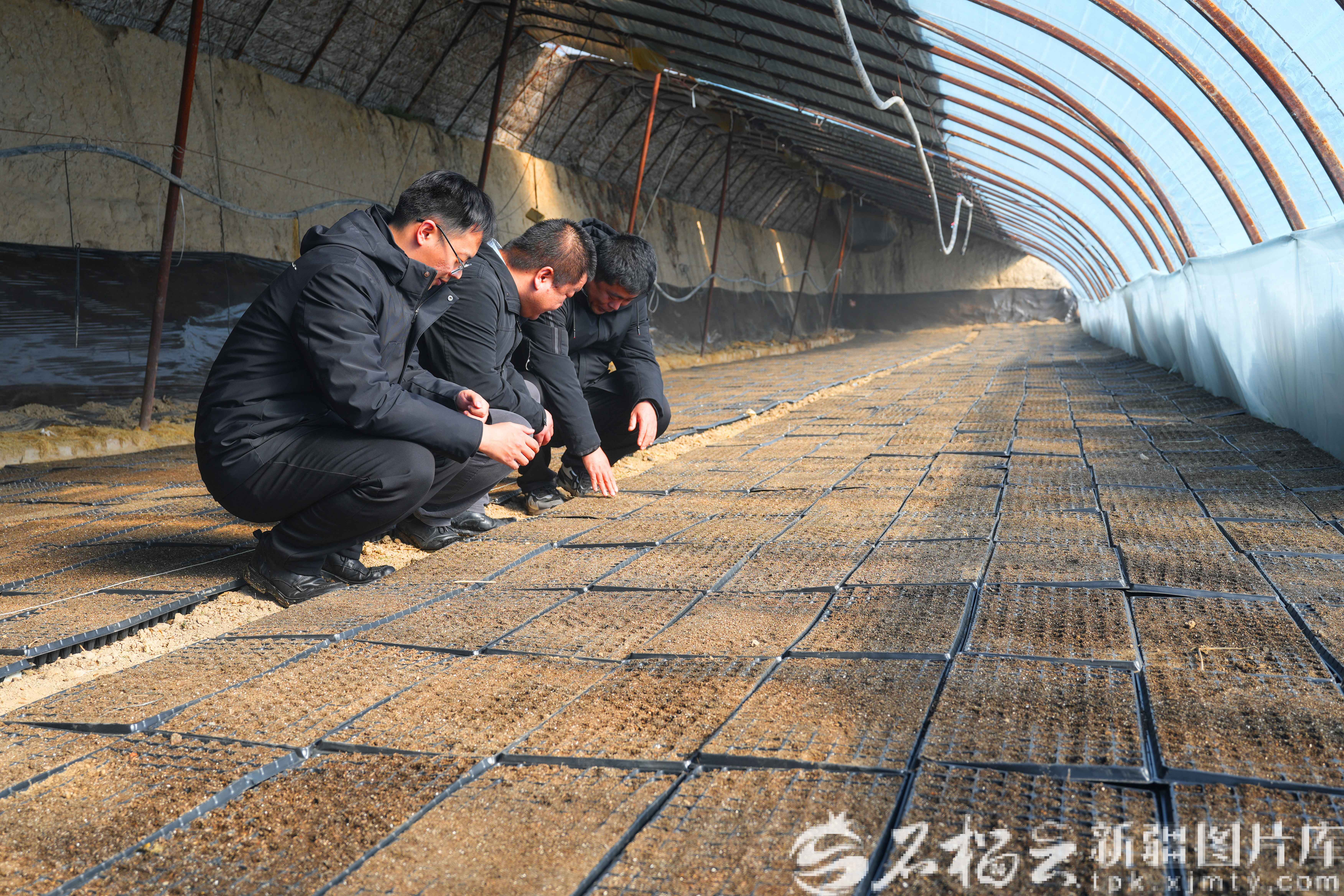 3月4日,在新疆生产建设兵团第九师167团设施农业基地的大棚内,技术人员在查看酱用番茄育苗情况。梁子燕摄