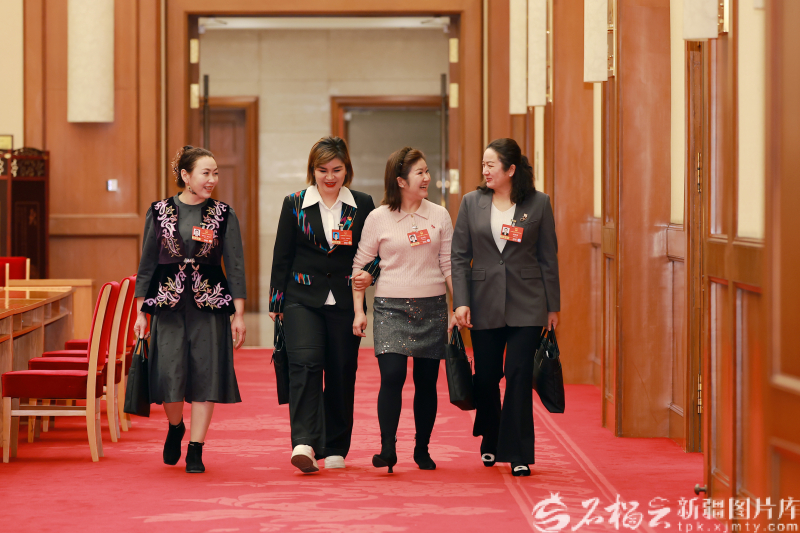 3月8日上午,十四届全国人大四次会议新疆代表团举行小组会议。当日是“三八”国际劳动妇女节,新疆代表团几位代表意气风发地前往会场。石榴云/新疆日报记者 崔志坚摄