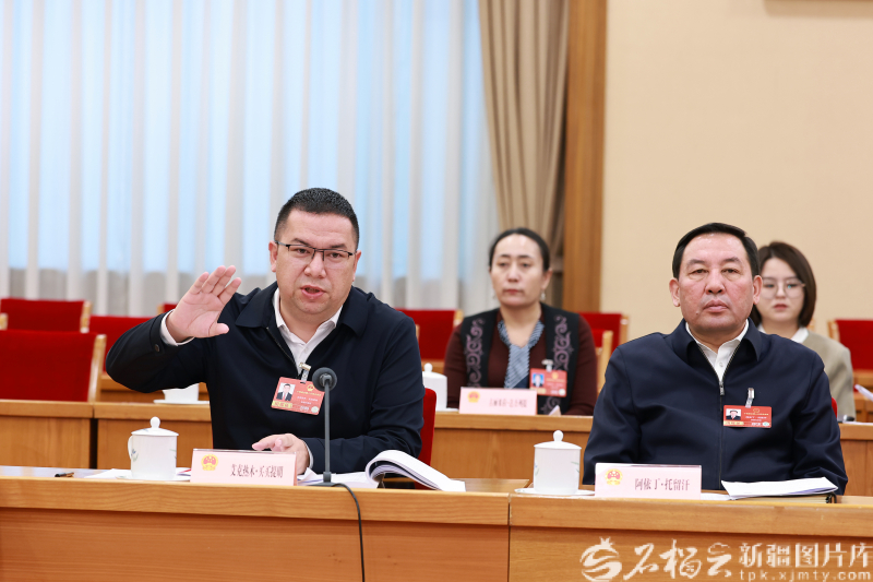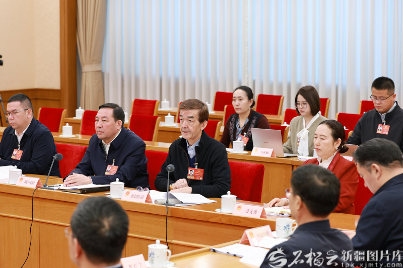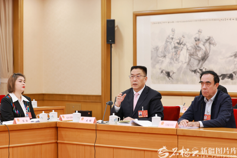 3月8日上午,十四届全国人大四次会议新疆代表团举行小组会议,审议生态环境法典草案。图为艾克热木·买买提明代表(前左)在发言时就法典出台后相关配套政策及时跟进完善,对西部地区给予更多支持以更好推动法律实施、政策落地等提出建议。石榴云/新疆日报记者 崔志坚摄
