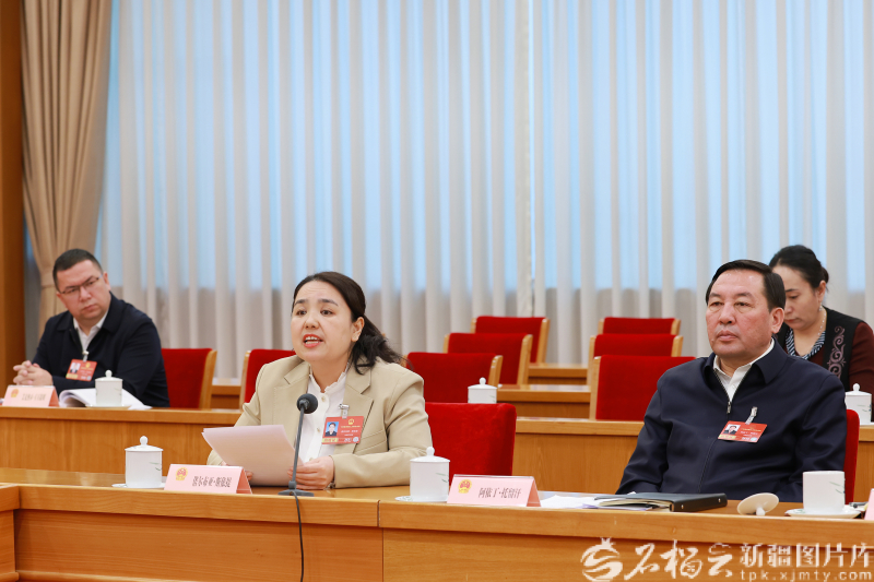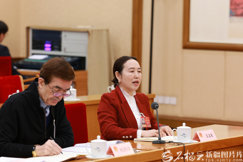 3月8日上午,十四届全国人大四次会议新疆代表团举行小组会议,审议生态环境法典草案。图为吴文秀代表(右)围绕建设美丽乡村等内容发言。石榴云/新疆日报记者 崔志坚摄