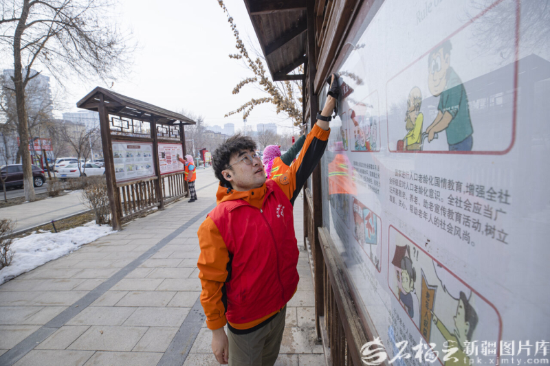 3月17日,昌吉市绿洲路街道海棠社区志愿者开展春季爱国卫生运动。图为志愿者和环卫工人一起清理文化宣传栏。巨海成摄