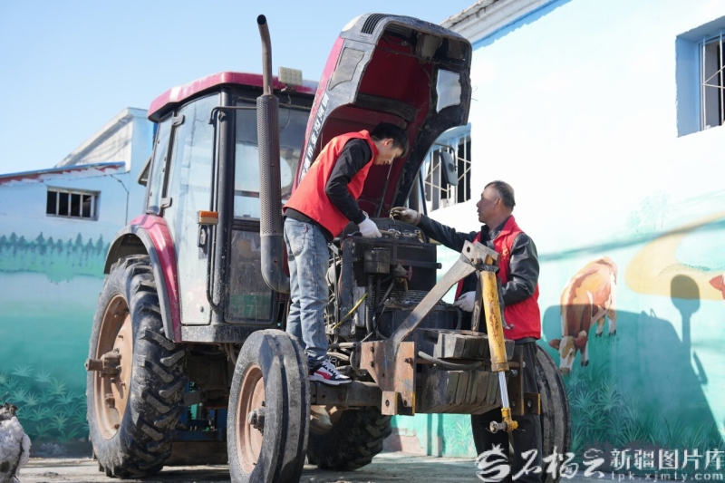 3月16日,沙湾市金沟河镇组织党员致富带头人、农技人员,来到宋圣宫村为农户检修农机,助力春耕生产。杨文秀摄