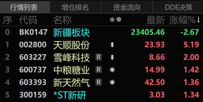 3月20日新疆板块股价涨幅排名(来源:东方财富)。 从消息面看,天顺股份在投资者关系活动中表示,公司2025年亏损2633万元的主要原因是单项计提坏账准备以及诉讼影响。 雪峰科技2025年年度报告摘要显示,报告期内,公司实现营业收入55.64亿元,较上年同期下降8.81%;实现归属于上市公司股东的净利润50367.14万元,较上年同期下降24.65%;实现扣非后归属于上市公司股东的净利润为48351.62万元,较上年同期下降25.24%。 西域旅游3月20日披露2025年年度报告。2025年,公司实现营业总收入3.26亿元,同比增长7.32%;归母净利润7468.15万元,同比下降13.68%;扣非净利润7479.31万元,同比下降12.72%。公司2025年度分配预案为:拟向全体股东每10股派现3元(含税)。 3月19日,汇嘉时代发布公告称,公司2025年前三季度利润分配方案为:向全体股东每股派发现金红利0.10元(含税),合计派发现金红利46533756.80元(含税)。 环球市场: 美股三大指数3月19日收盘全线下跌。截至收盘,道琼斯工业平均指数下跌203.72点,收于46021.43点,跌幅0.44%;标准普尔500种股票指数下跌18.21点,收于6606.49点,跌幅为0.27%;纳斯达克综合指数下跌61.73点,收于22090.69点,跌幅为0.28%。 欧洲三大股指3月19日全线下跌。英国伦敦股市《金融时报》100种股票平均价格指数报收于10063.5点,下跌241.79点,跌幅为2.35%;法国巴黎股市CAC40指数报收于7807.87点,下跌162.01点,跌幅为2.03%;德国法兰克福股市DAX指数报收于22839.56点,下跌662.69点,跌幅为2.82%。 截至当天收盘,纽约商品交易所4月交货的轻质原油期货价格下跌18美分,收于每桶96.14美元,跌幅为0.19%;5月交货的伦敦布伦特原油期货价格上涨1.27美元,收于每桶108.65美元,涨幅为1.18%。 3月19日,COMEX黄金期货下跌244.30美元,跌幅4.99%,报4651.9美元/盎司。COMEX白银期货下跌4.78美元,跌幅6.16%,报72.81美元/盎司。现货黄金下跌168.11美元,跌幅3.49%,报4650.77美元/盎司。现货白银下跌2.56美元,跌幅3.40%,报72.81美元/盎司。 财经资讯: 1.石榴云:3月19日,2026年金融赋能水利基础设施建设交流会在乌鲁木齐市举办,7个地州市的水投(务)公司、水利建设单位与金融机构集中签约,达成融资意向金额47.5亿元。 2.证券时报:3月19日,财政部公布的2026年1—2月财政收支运行情况显示,今年前两个月全国一般公共预算收入达4.42万亿元,同比增长0.7%;全国一般公共预算支出4.67万亿元,同比增长3.6%。 3.证券时报:证券时报•数据宝统计显示,截至3月19日,两市ETF两融余额为1179.83亿元,较上一交易日增加13.40亿元,环比增加1.15%,其中,ETF融资余额为1098.92亿元,较上一交易日增加13.96亿元,环比增加1.29%。 4.中国证券报:国家外汇局党组日前召开扩大会议提出,提升资本项目开放水平,完善境外放款、跨国公司本外币一体化资金池等政策,助力更好拓展国际循环。 5.证券日报:3月20日,随着浙江新恒泰新材料股份有限公司上市,北京证券交易所存量上市公司数量达到300家。 6.证券日报:据工业和信息化部官网消息,工业和信息化部、国家发展改革委、市场监管总局于3月17日联合召开新能源汽车行业企业座谈会,部署进一步规范新能源汽车产业竞争秩序、提升产业创新能力、扩大汽车消费、优化行业管理等重点工作。 7.新华社:2025年以来各级市场监管部门强化反垄断监管执法,全年办结市场垄断案件22件,审结经营者集中706件,推动市场竞争环境不断优化。 8.新华社:今年前2个月,我国邮政行业寄递业务量累计完成331.4亿件,同比增长5.6%。其中,快递业务量累计完成304.9亿件,同比增长7.1%。 9.中证网:北京时间3月19日晚,欧洲中央银行召开货币政策会议,决定维持三大关键利率不变。欧洲央行当天发布新闻公报说,存款机制利率、主要再融资利率和边际借贷利率分别维持在2.00%、2.15%和2.40%。 ——观全球股市·察中国经济·抢新疆机遇——