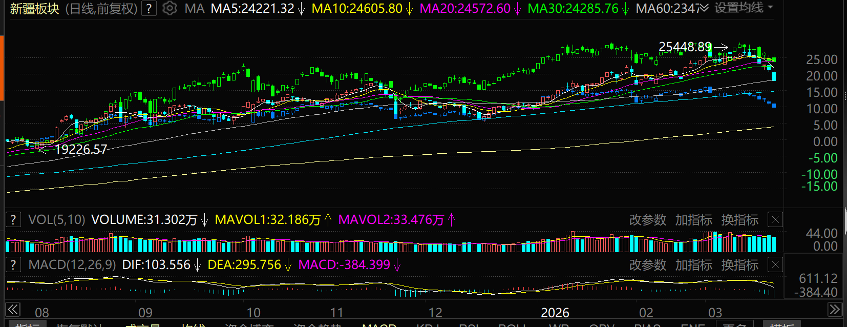 创业板指日K线图(来源:东方财富)。 港股3月20日收盘走低,恒生指数收报25277.32点,跌223.26点,跌幅0.88%;恒生科技指数收报4872.38点,跌123.9点,跌幅2.48%。恒生指数成分股中李宁、宁德时代、吉利汽车涨幅居前。恒生科技指数成分股中地平线机器人-W、理想汽车-W、零跑汽车涨幅居前。 3月20日A股收盘时,新疆板块指数跌2.67%,报收23405.46点,9只股票上涨,51只股票下跌,2只股票平盘,个股上涨比例为14.52%,总换手率2.75%,总成交额359.06亿元。