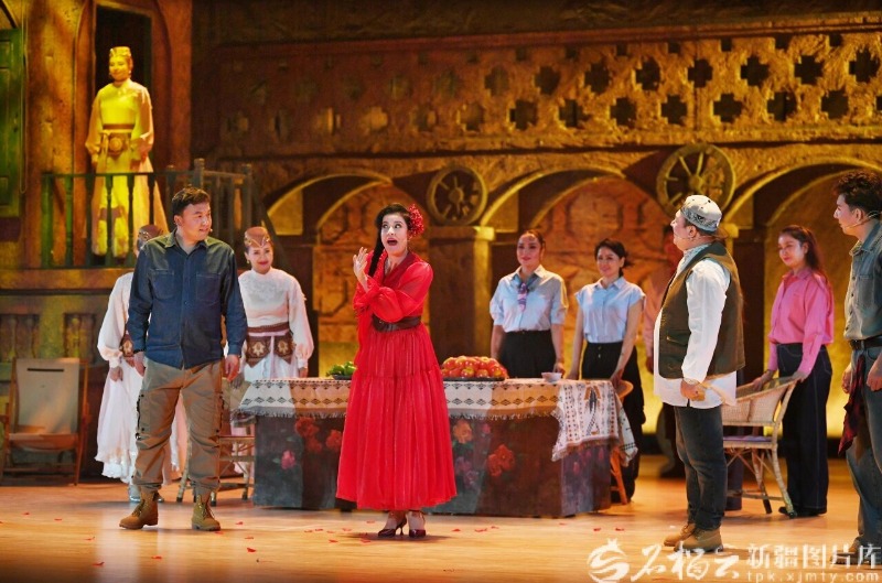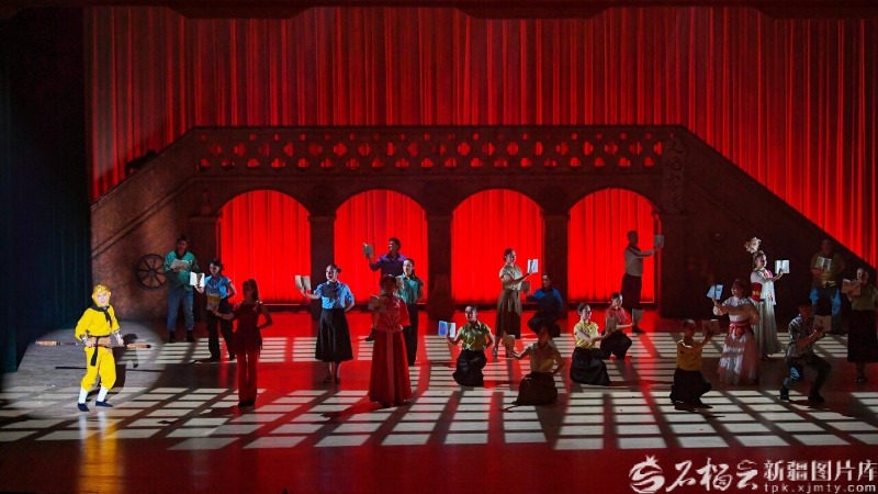 3月20日,演员在托克逊县影剧院表演原创音乐剧《火焰西游》。 音乐剧《火焰西游》是新疆艺术剧院歌剧团精心打磨、倾力打造的本土原创精品剧目,剧目以家喻户晓的经典名著《西游记》为核心创作蓝本,跳出传统名著改编的固化思路,创新性融入当代生活视角与现实人文关怀,跳出神话故事的奇幻框架,聚焦当下普通人的生活与心境。剧中围绕作家、网络主播、流浪乐手、迷茫导游等不同身份、怀揣不同心事的普通群体展开叙事,讲述了他们在火焰山下偶然相遇、彼此陪伴、相互治愈,最终走出人生低谷与内心困境,实现自我和解与成长蜕变的温暖故事,让经典IP与现实生活实现了巧妙融合,引发观众强烈情感共鸣。