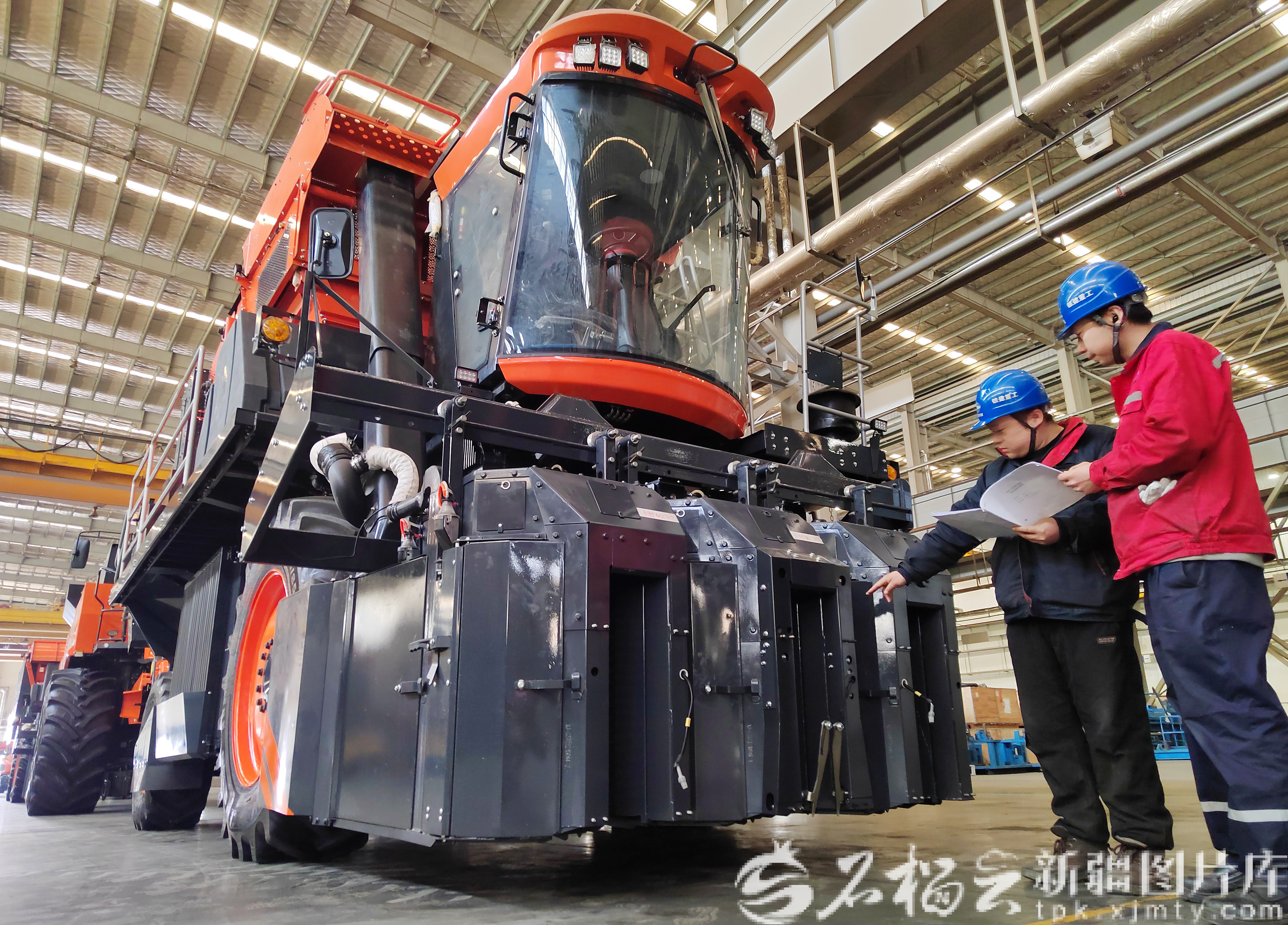 3月25日,工作人员在采棉机装配线上巡检。