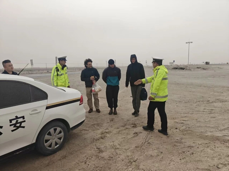 经了解,3名人员均为法国格勒诺布尔-阿尔卑斯大学的学生,其中两人为法国籍,一人为比利时籍。3人原本计划前往且末县,因当日无直达且末县的列车,便打算在315国道搭乘便车前往目的地,可受强沙尘天气影响,路面车辆稀少,难以同时搭乘到顺路车辆,无奈之下只能徒步前行。考虑到强沙尘天气下徒步出行的极高危险性,执勤民警驾驶警车护送3人到达且末县。