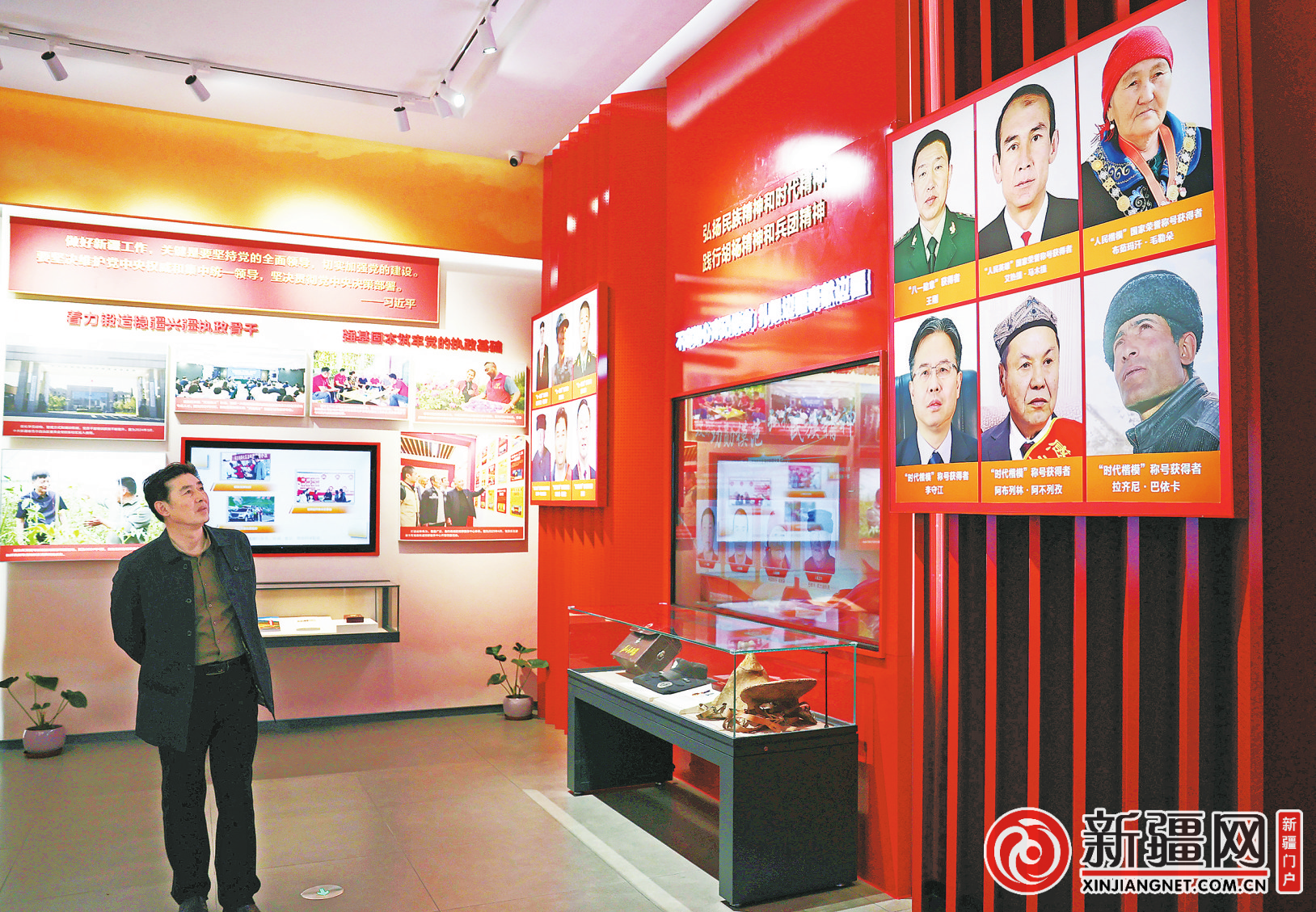 “新疆维吾尔自治区成立70周年”主题成就展现场,一位参观者了解榜样楷模的先进事迹。(记者王畅彤摄)