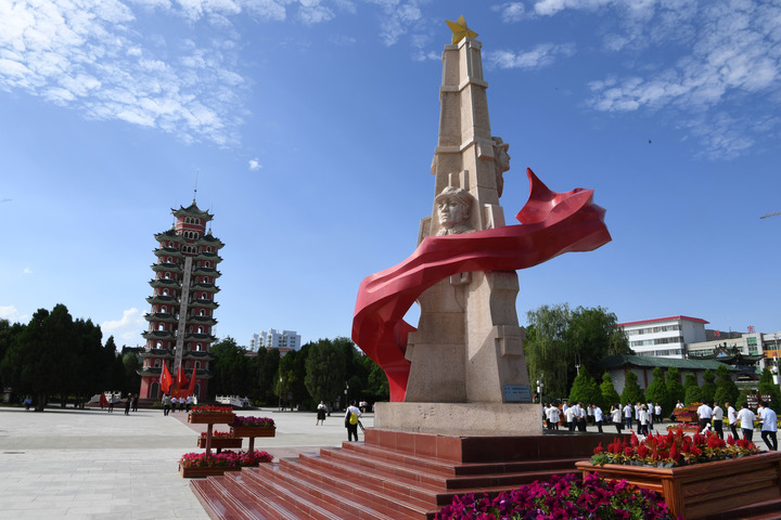 这是2019年7月22日在甘肃会宁县红军会宁会师旧址拍摄的雕塑和会师纪念塔。新华社记者 马宁 摄 新的长征路上,面对许多仍需跨越的“雪山”“草地”,仍需征服的“娄山关”“腊子口”,习近平总书记引领全党凝心聚力,矢志奋斗,依靠顽强斗争打开事业发展新天地——