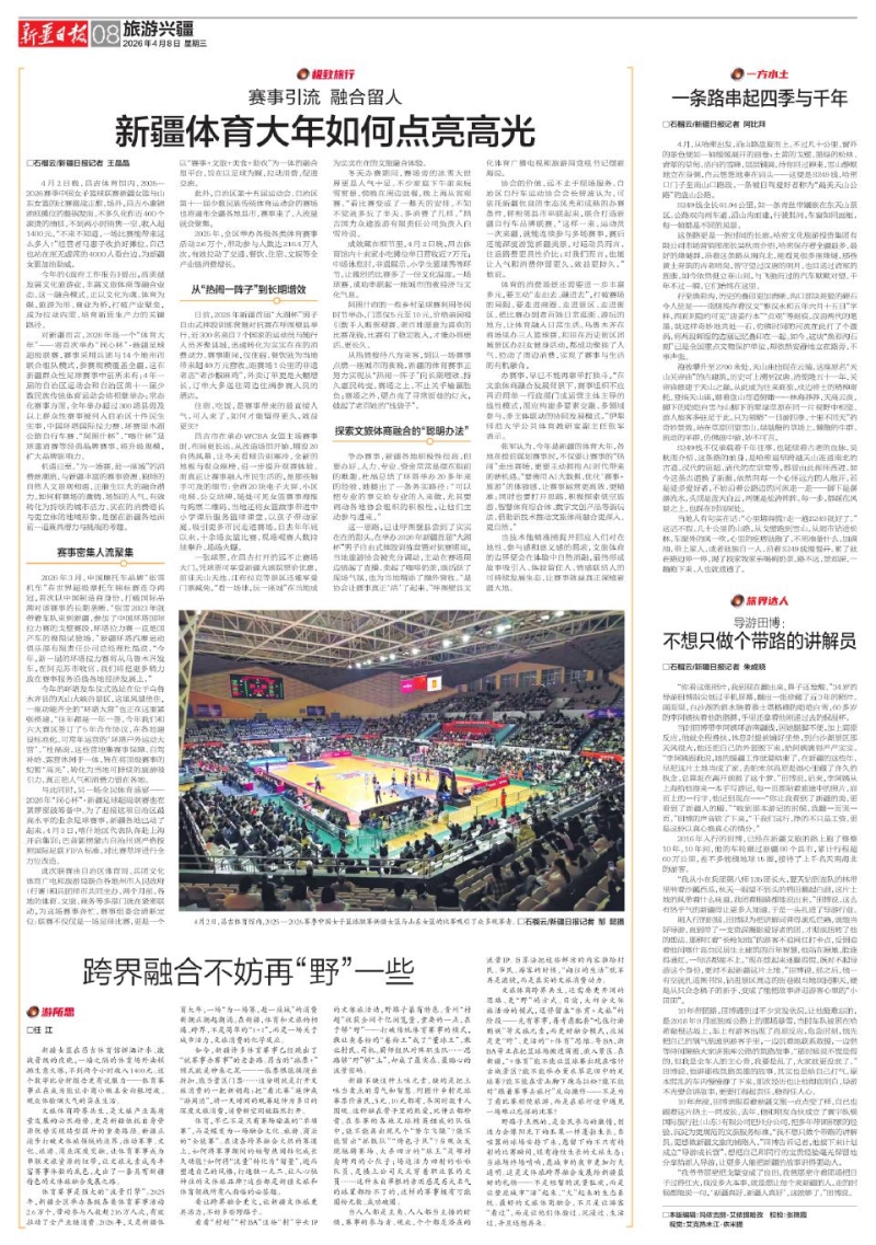石榴云/新疆日报记者 王晶晶 4月2日晚,昌吉体育馆内,2025—2026赛季中国女子篮球联赛新疆女篮与山东女篮的比赛激战正酣。场外,昌吉小惠锦油糕摊位的整锅发面,不多久化作近400个滚烫的油糕,不到两小时销售一空,收入超1400元。“不来不知道,一场比赛能带来这么多人!”经营者马惠子收拾好摊位,自己也站在座无虚席的4000人看台边,为新疆女篮加油助威。 今年的《政府工作报告》提出,高质量发展文化旅游业,丰富文旅体商等融合业态。这一融合模式,正以文化为魂、体育为媒、旅游为形、商业为桥,打破产业壁垒,成为拉动内需、培育新质生产力的关键路径。 对新疆而言,2026年是一个“体育大年”——将首次举办“同心杯”·新疆足球超级联赛,赛事采用兵团与14个地州市联合组队模式,参赛规模覆盖全疆,这在新疆群众性足球赛事中前所未有;4年一届的自治区运动会和自治区第十一届少数民族传统体育运动会将相继举办;常态化赛事方面,全年举办超过300场县级及以上群众性赛事被列入自治区十件民生实事,中国环塔国际拉力赛、环赛里木湖公路自行车赛、“阿图什杯”、“喀什杯”足球邀请赛等经典品牌赛事,将升级规模,扩大品牌影响力。 机遇已至。“为一场赛,赴一座城”的消费新潮流,与新疆丰富的赛事资源、独特的自然人文景观相遇,正催生巨大的融合潜力。如何将赛场的激情、场馆的人气,有效转化为持续的城市活力、实在的消费增长与更立体的地域形象,是摆在新疆各地面前一道兼具潜力与挑战的考题。
